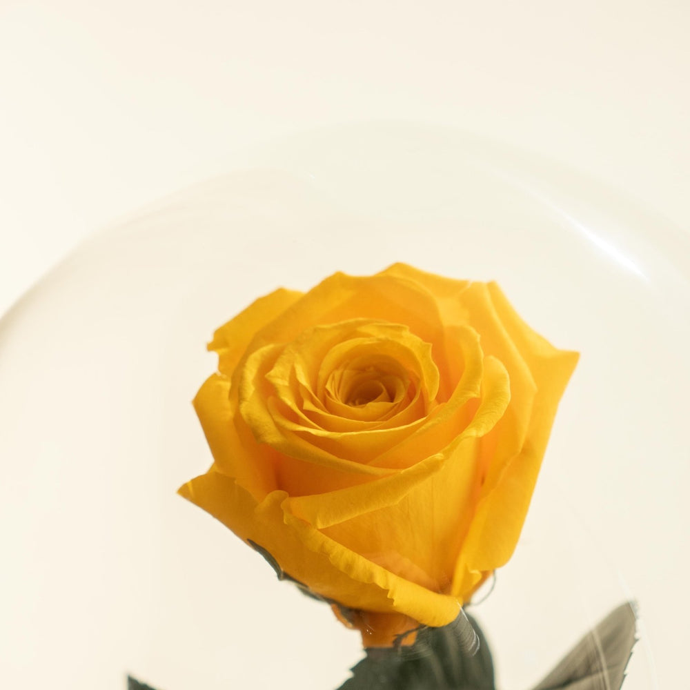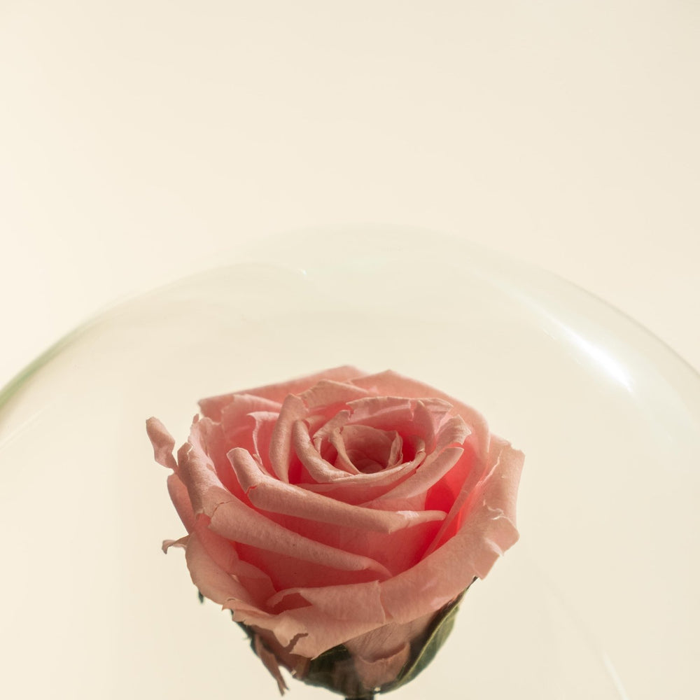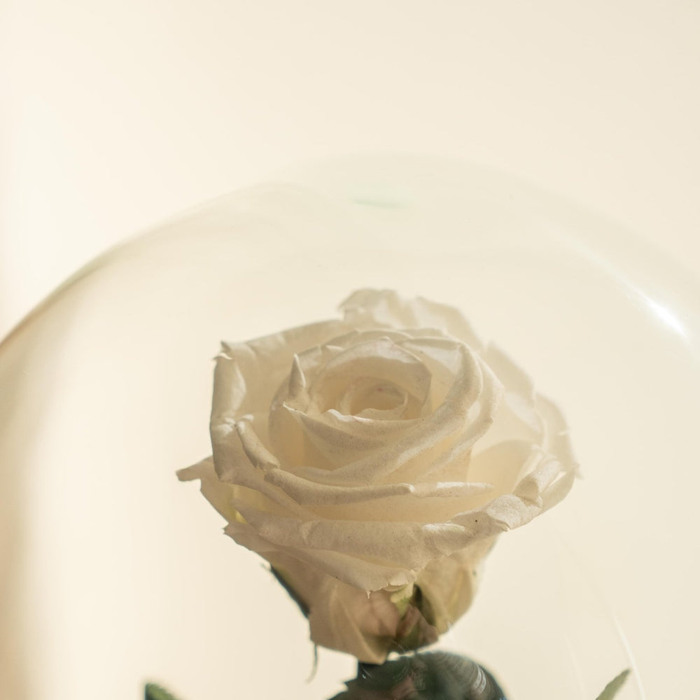 Se trata de una rosa de jardín natural que se ofrece con su campana para realzarla pero también para protegerla del polvo.