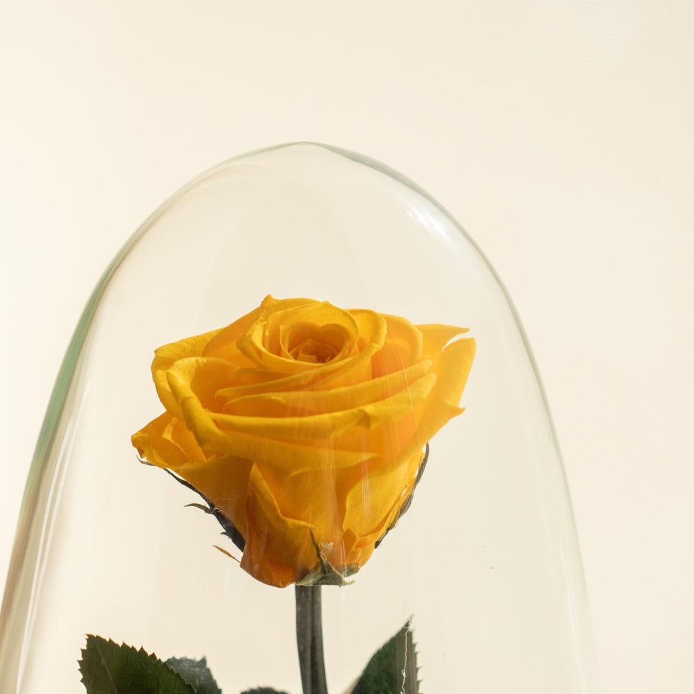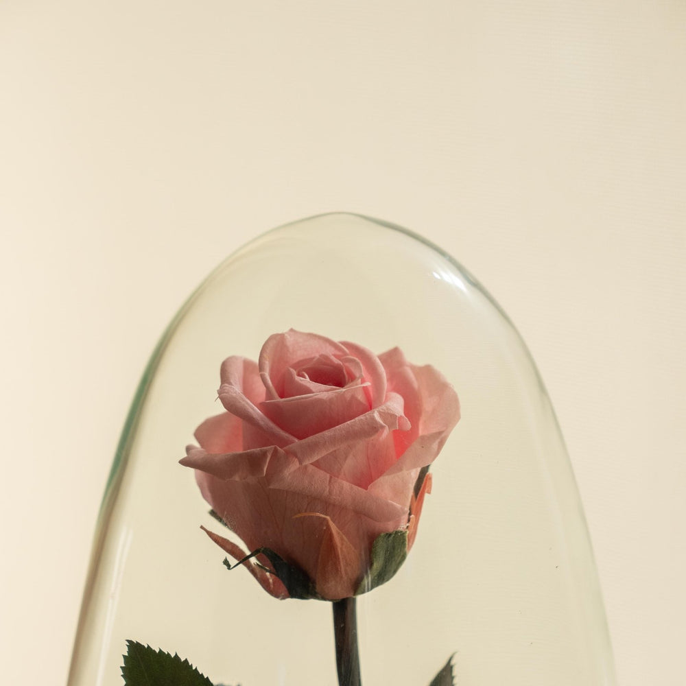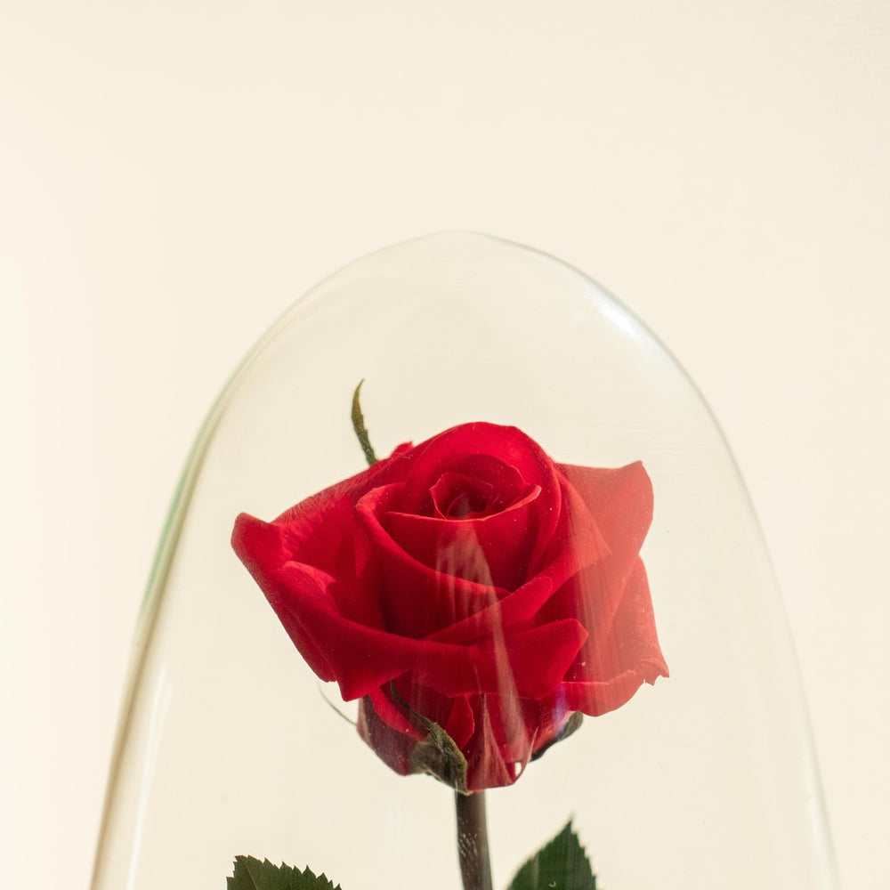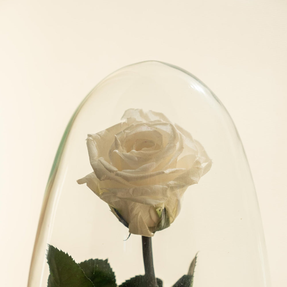 Aquí te ofrecemos una composición estabilizada de una rosa natural bajo una campana de cristal para resaltarla pero también protegerla del polvo.
