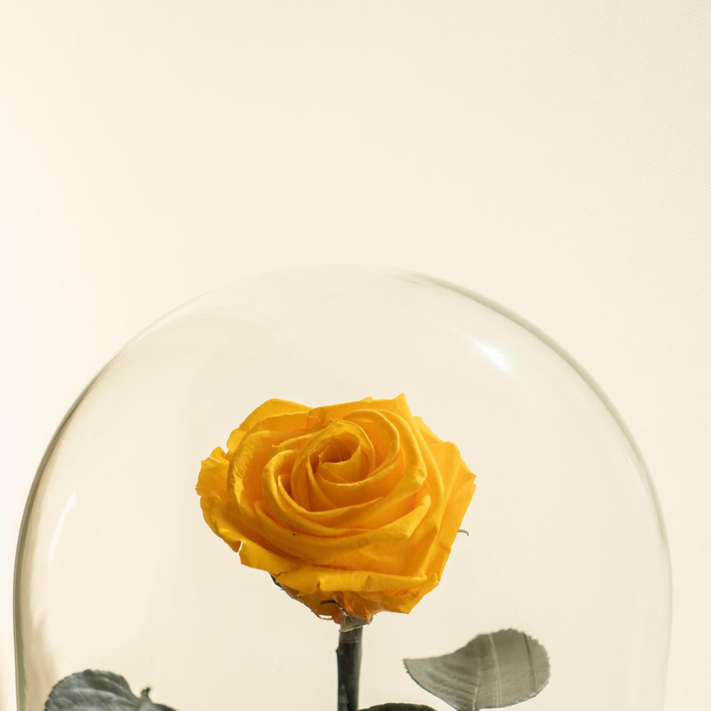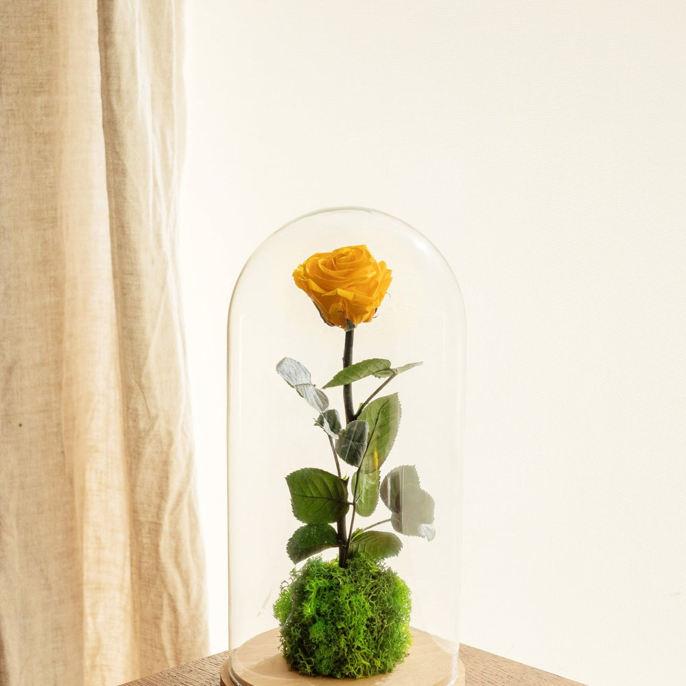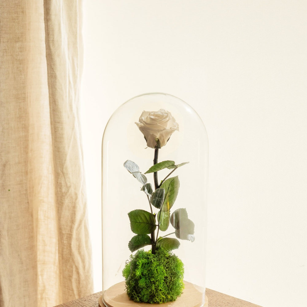 Se trata de una rosa de jardín natural que se ofrece con su campana para realzarla pero también para protegerla del polvo.