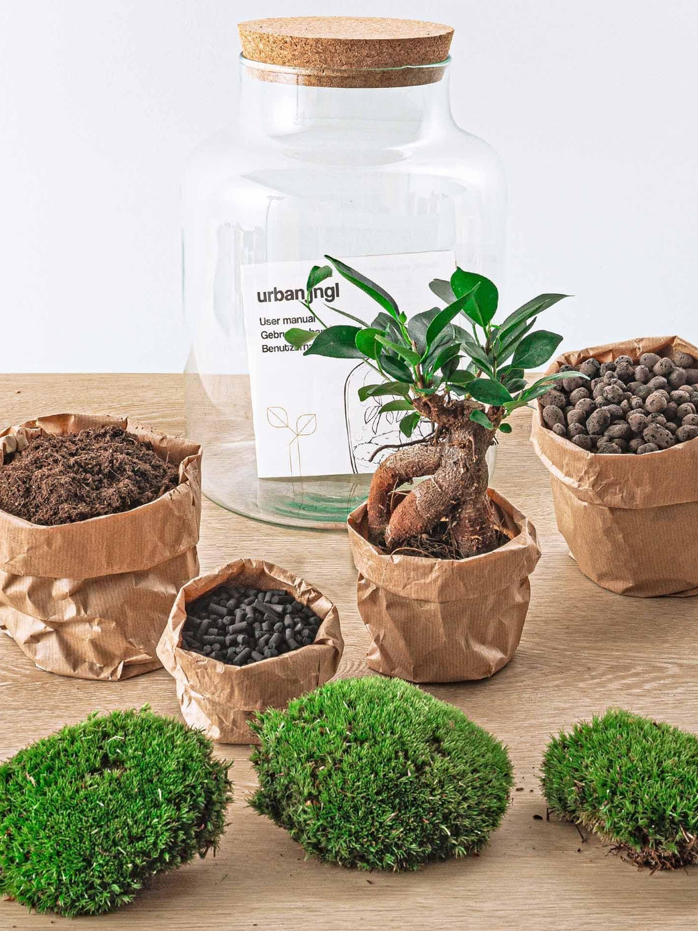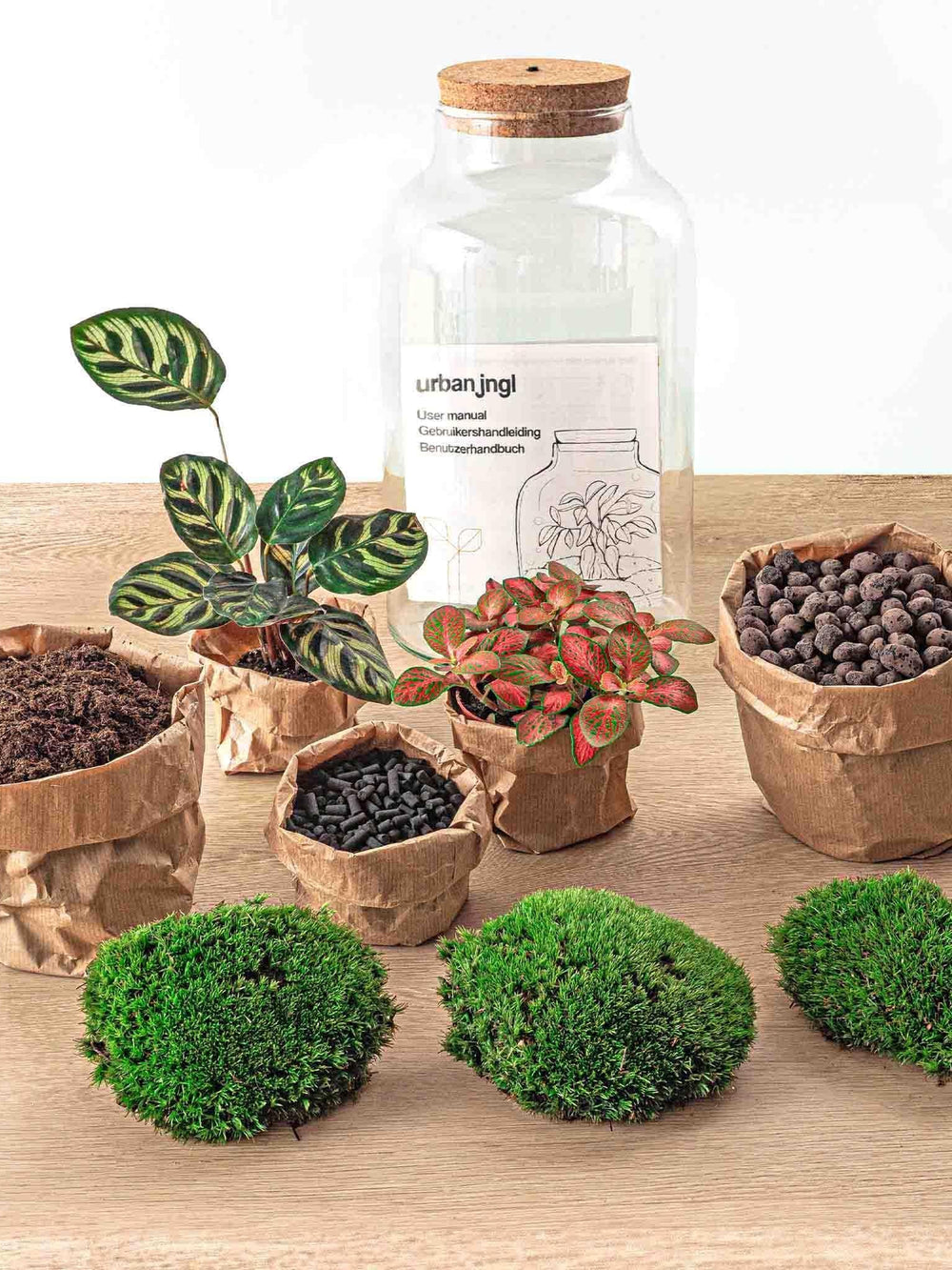 Cada kit se compone de todo lo necesario para hacer un terrario: un jardín en miniatura casi autónomo y autosuficiente. ¡Ideal cuando no tienes buenas manos para la jardinería!