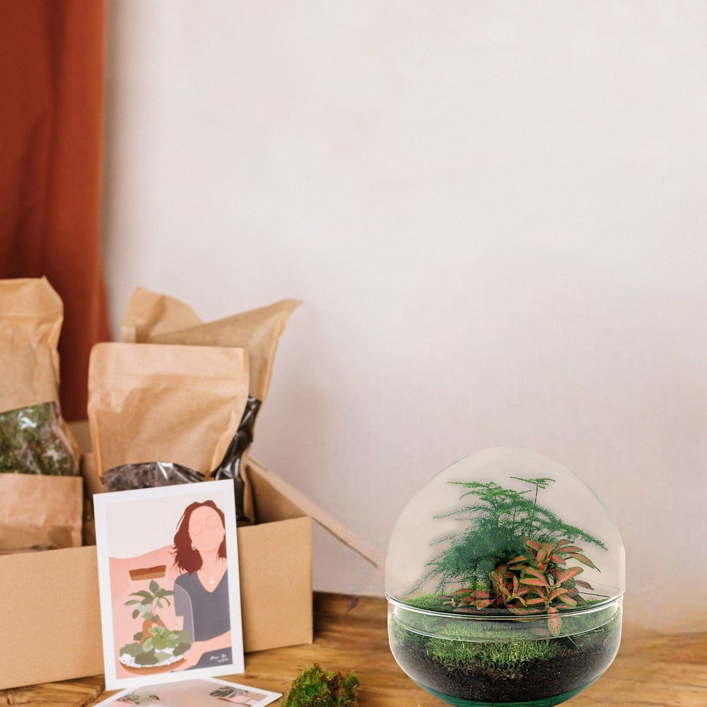 Cada kit se compone de todo lo necesario para hacer un terrario: un jardín en miniatura casi autónomo y autosuficiente. ¡Ideal cuando no tienes buenas manos para la jardinería!