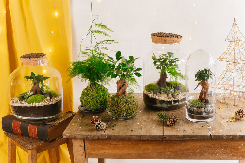Ya sea para un terrario, una kokedama o una jardinera, las plantas utilizadas tienen la misma necesidad de luz, es decir, buena exposición, buena luz pero sin sol directo.