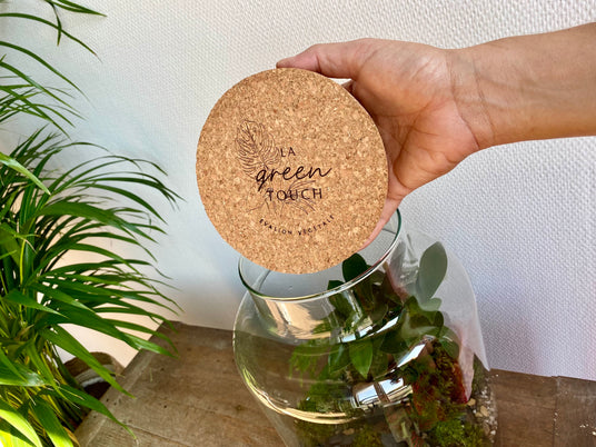 Gravez votre logo ou un message sur un pot en terre cuite, un bocal en verre pour nos terrariums ou bien sur un socle adapté aux kokedama